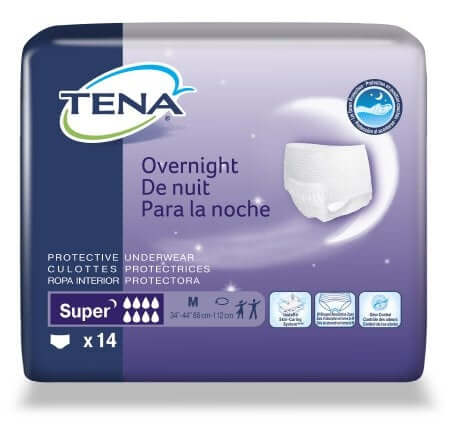 Tena Overnight Super Protective Underwear is Tena's newest and highest absorbency underwear! It's more absorbent than the Overnight in the white and yellow bag and it's 35% more absorbent than Tena Extra Underwear.